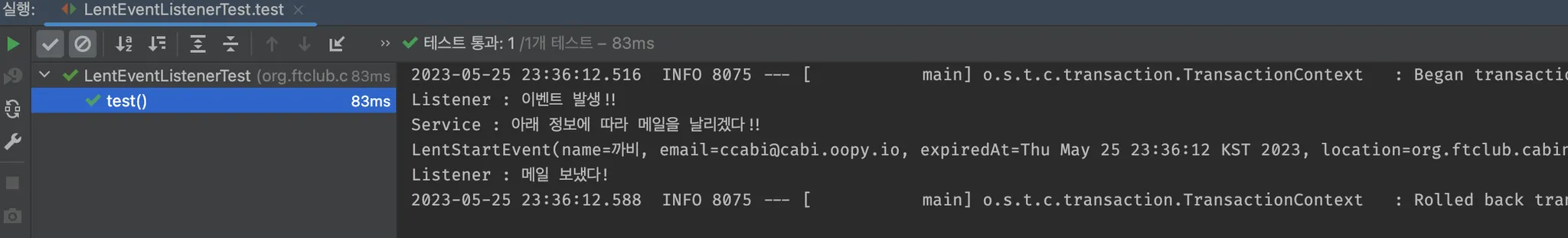 이전에 만들어 놓은 EventTestService를 호출하면 다음과 같이 테스트가 잘 동작하는 것을 볼 수 있다.
