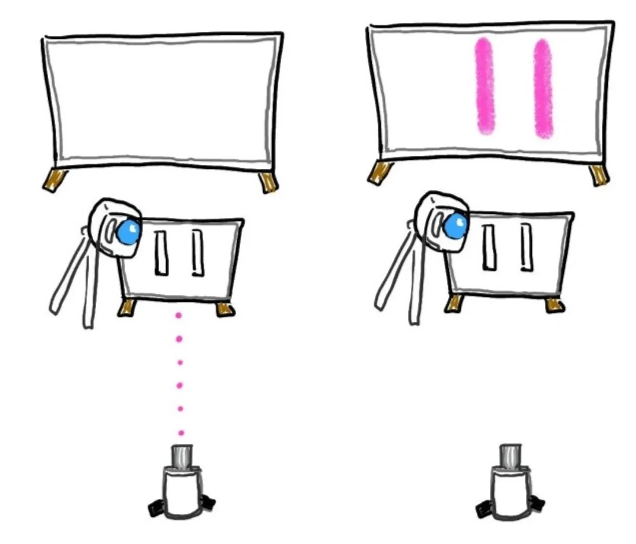 만약 빛이 입자라면 좌측 그림과 같이 직진을 하게 될테지만, 실제 빛은 장애물을 지나 회절(휘어짐)하여 장애물이 가리고 있는 뒤쪽의 벽에도 도달하게 됩니다.