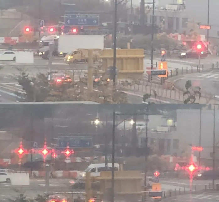 여러분은 위 두 사진의 차이가 왜 발생하는지 아시나요? 위 두 사진 중 첫 번째 사진은 방충망이 없는 창문에서 찍은 사진이고, 빛이 번지는 현상이 나타나는 두 번째 사진은 방충망을 통해서 찍은 사진입니다.