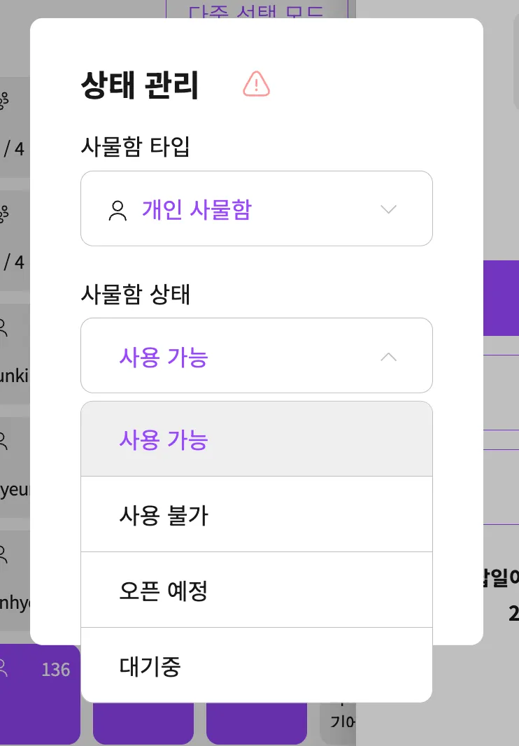 사물함의 상태를 사용가능/사용불가/오픈예정/대기중으로 변경할 수 있습니다.
