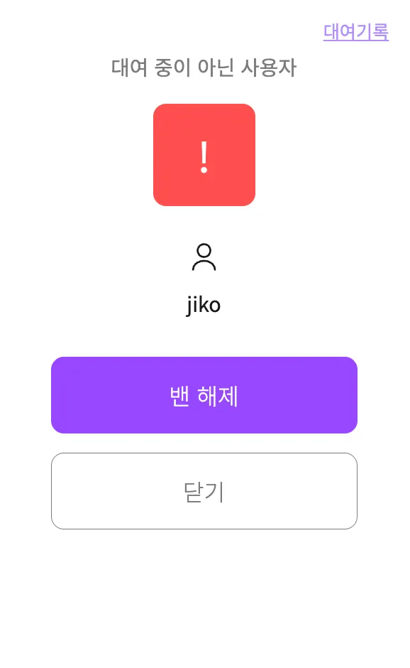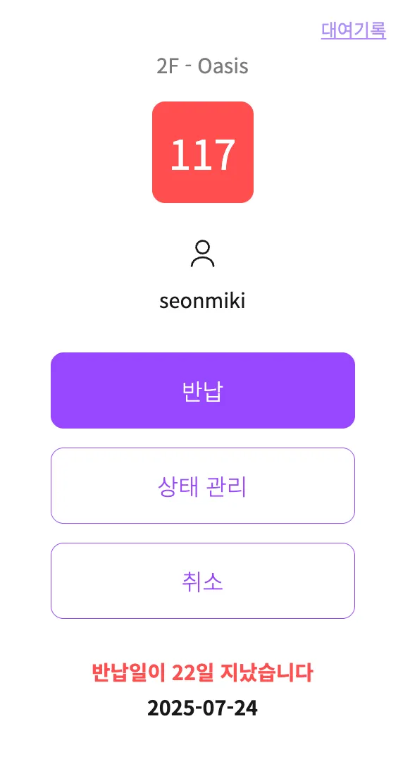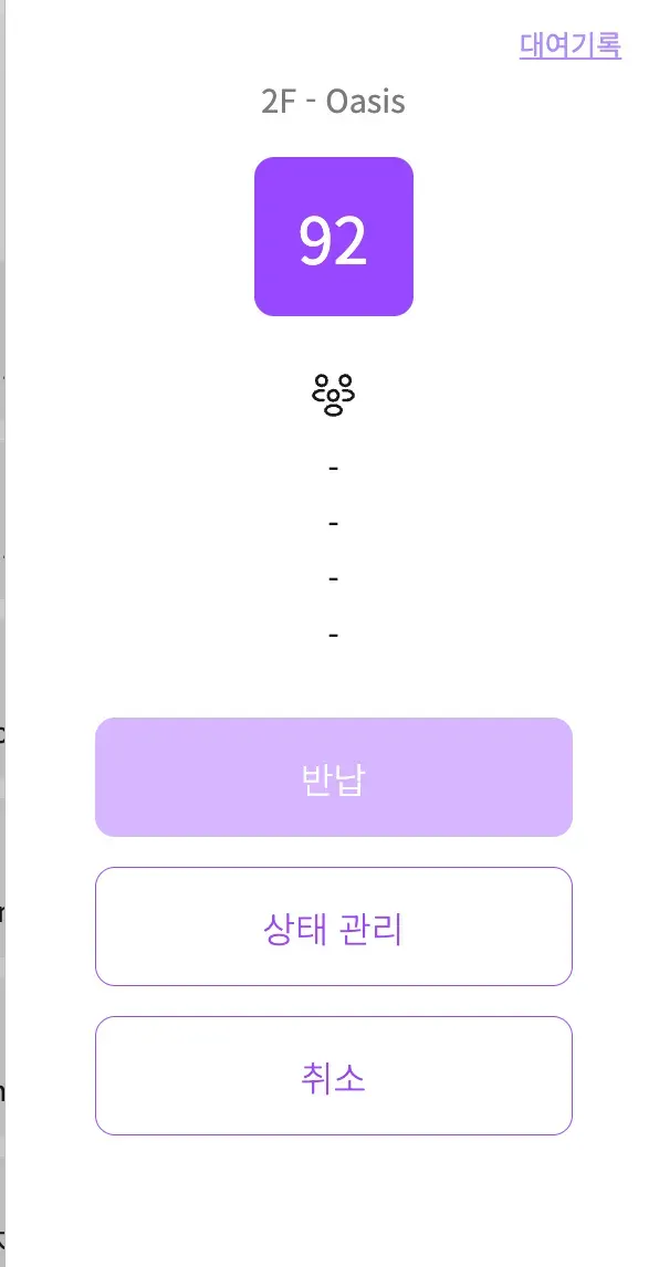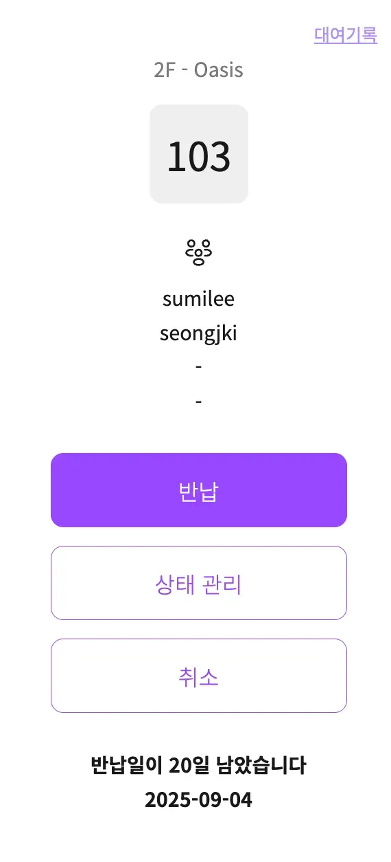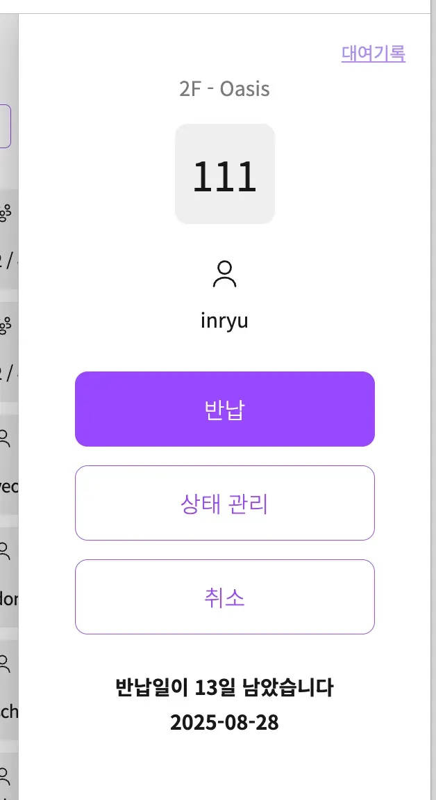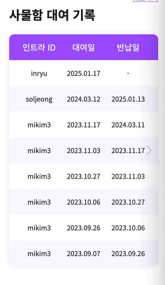 오른쪽 상단 대여기록을 클릭해 해당 사물함의 대여했던 유저들의 리스트를 확인할 수 있습니다.