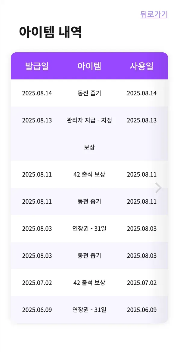 사용자 인트라 id 검색 → 아이템 관리 클릭→ 우측 상단 아이템 기록을 클릭하면 해당 사용자의 아이템 이용 내역을 확인할 수 있습니다.