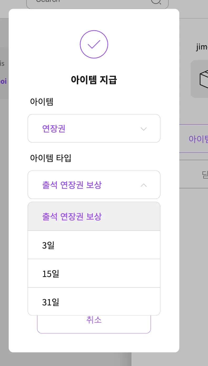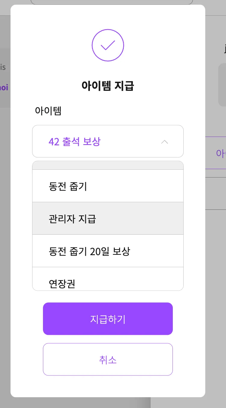 인트라 id 로 검색 시 사용자의 아이템 기록을 확인하거나 재화/아이템을 지급할 수 있습니다.