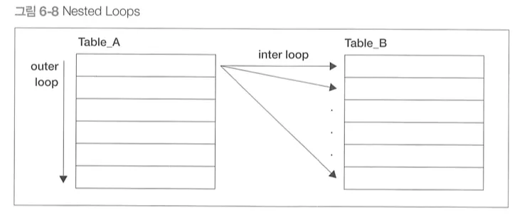 외부 테이블의 레코드 하나마다 내부 테이블(B)의 레코드를 하나씩 스캔 후 결합 조건에 맞는지 검사