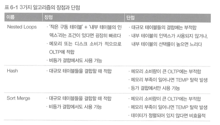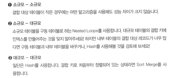 결합 알고리즘은 기본적으로 Nested Loops를 사용하되, 테이블의 규모등에 따른 경우에 따라서 Hash와 Sort Merge를 고려한다.