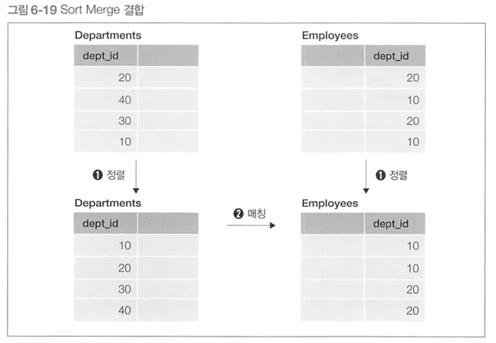 결합 대상 테이블들을 각각 결합 키로 정렬하고, 일치하는 결합 키를 찾으면 결합한다.