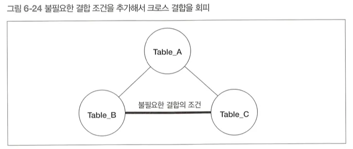 서로 간의 결합 조건이 없는 테이블 사이에 불필요하지만 결합 결과에 영향을 미치지 않는 결합 조건을 추가해주면 된다.