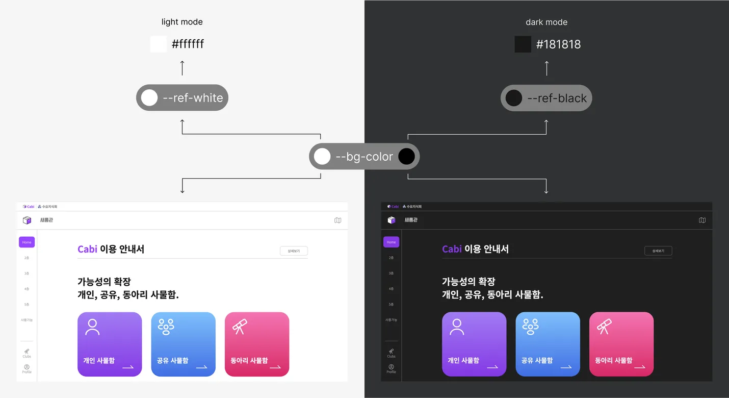 배경 색에 관련된 컴포넌트 토큰(--bg-color)은 라이트 또는 다크 모드 context에 따라 다른 레퍼런스 토큰 값을 가진다.