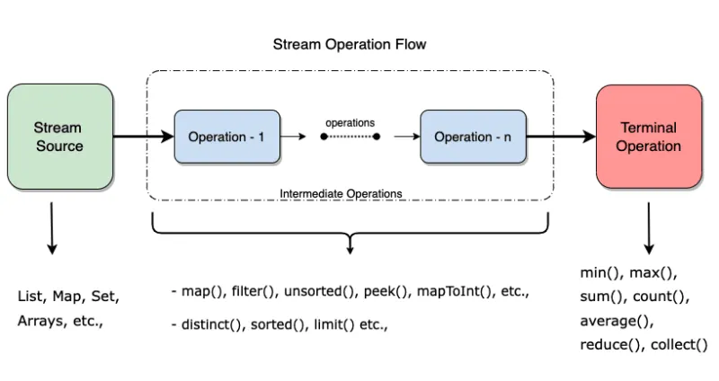 위에서도 언급되어 있듯이, 스트림의 연산들은 중간 연산과 최종 연산으로 구분할 수 있다. 데이터 소스를 중간 연산을 통해 가공하고 최종 연산으로 결과를 저장한다.