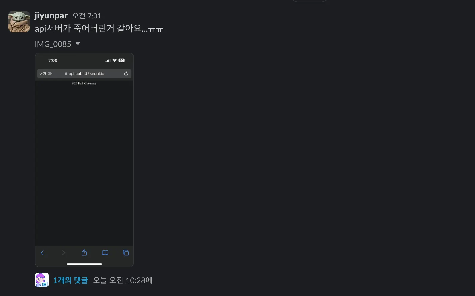 까비 슬랙 채널에 서버가 내려갔다는 제보가 들어왔다..!