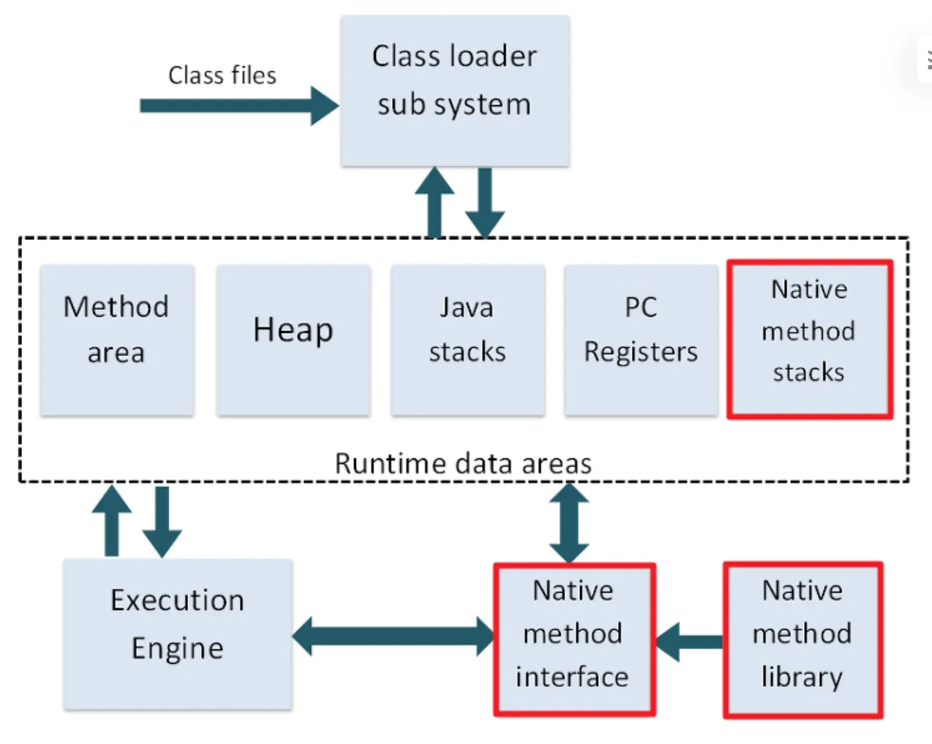 JNI와 연결되어 있어, native interface 호출 시 바이트 코드로 전환되어 Native Method Stack에 저장된다.