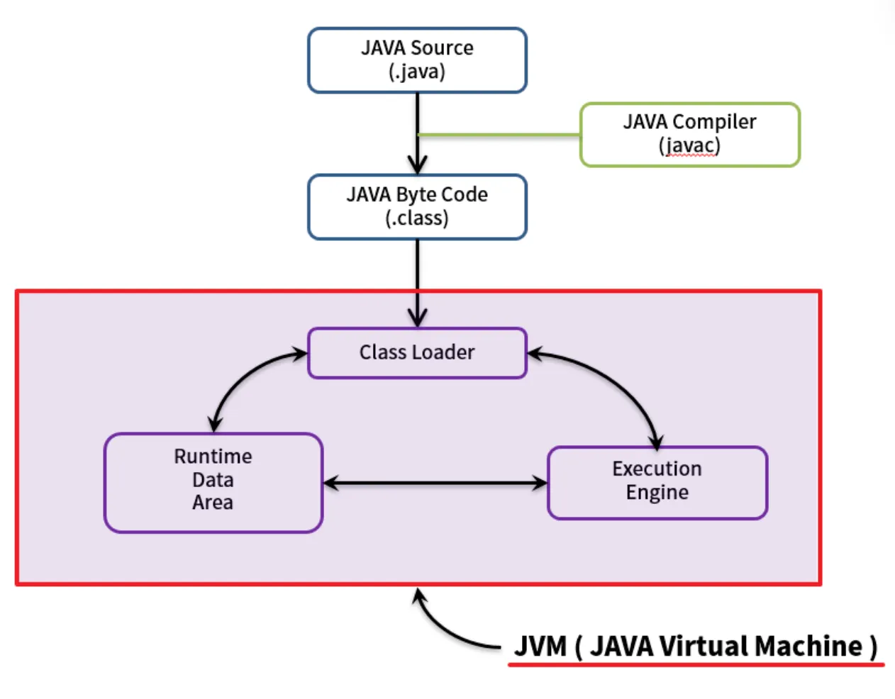 위 그림은 간략한 자바 어플리케이션의 구동절차를 나타낸 것으로, JVM은 빨간 박스 친 동작을 수행한다. 컴파일된 .class 파일을 특정한 방법으로 처리하여 프로그램을 실행시키는 것이다.