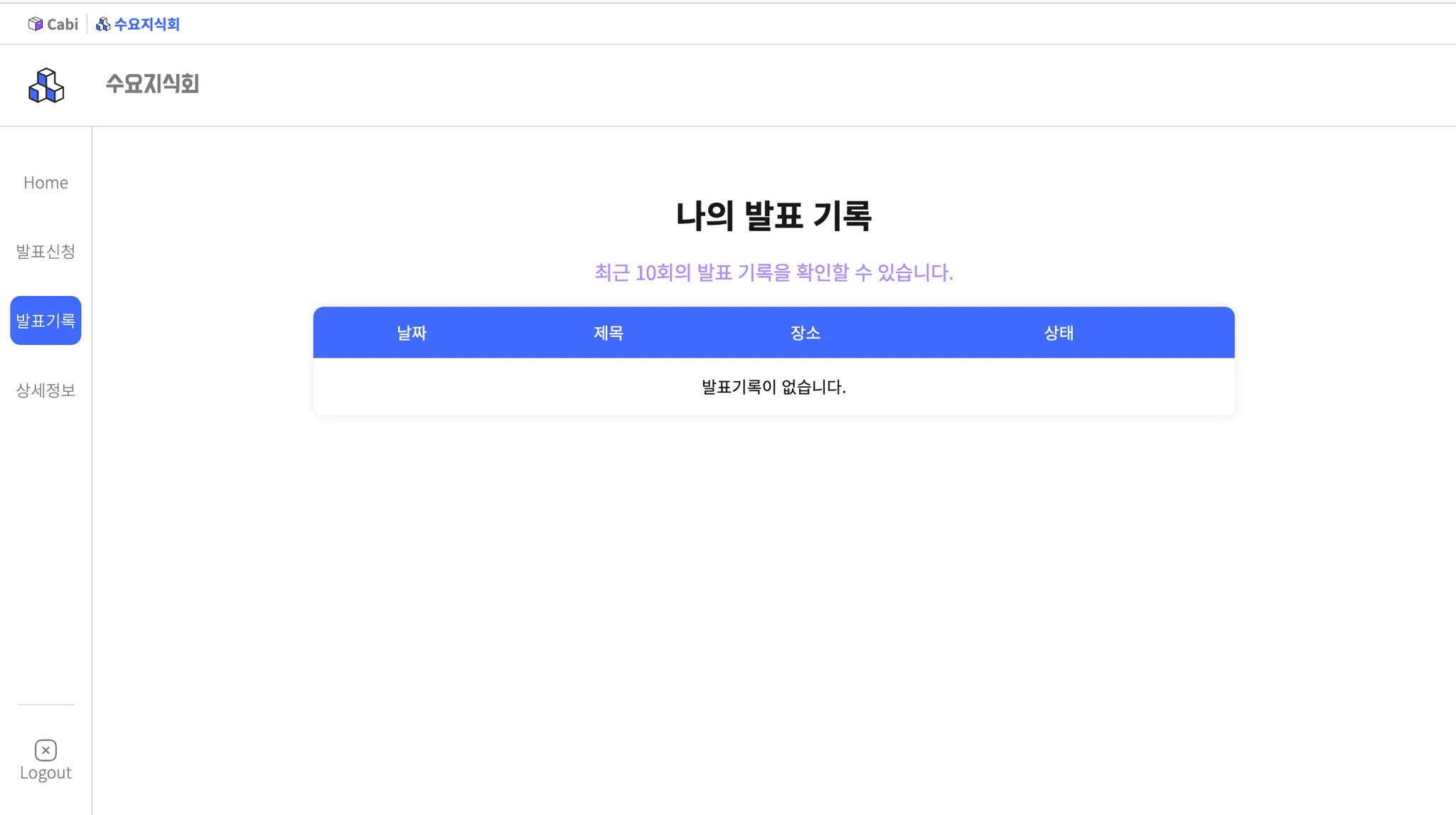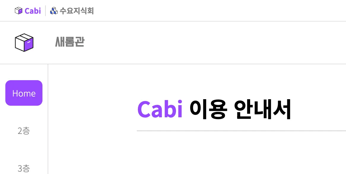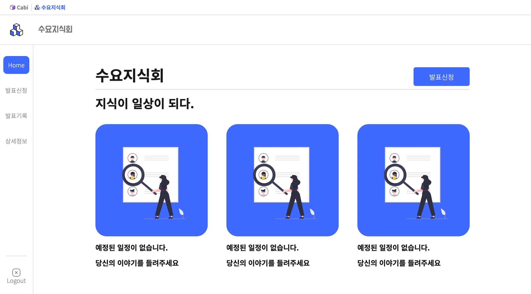 기존 Cabi 홈페이지 상단의 수요지식회 탭을 눌러 수요지식회 신청 서비스로 이동 할 수 있습니다.