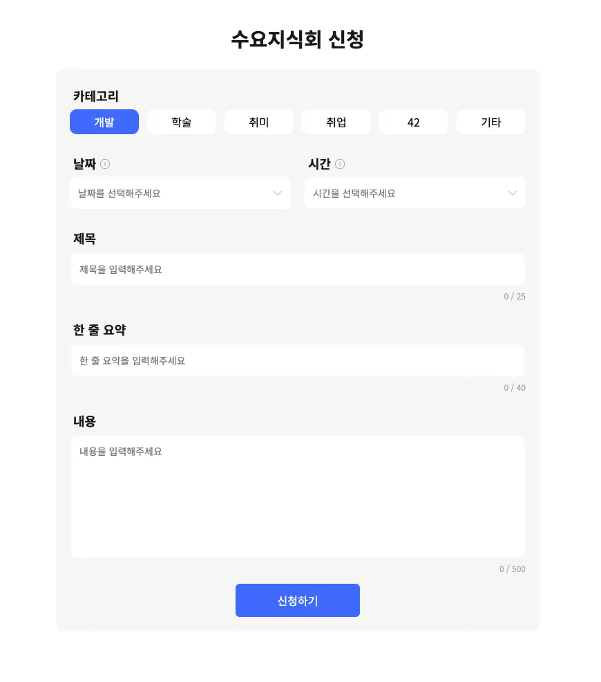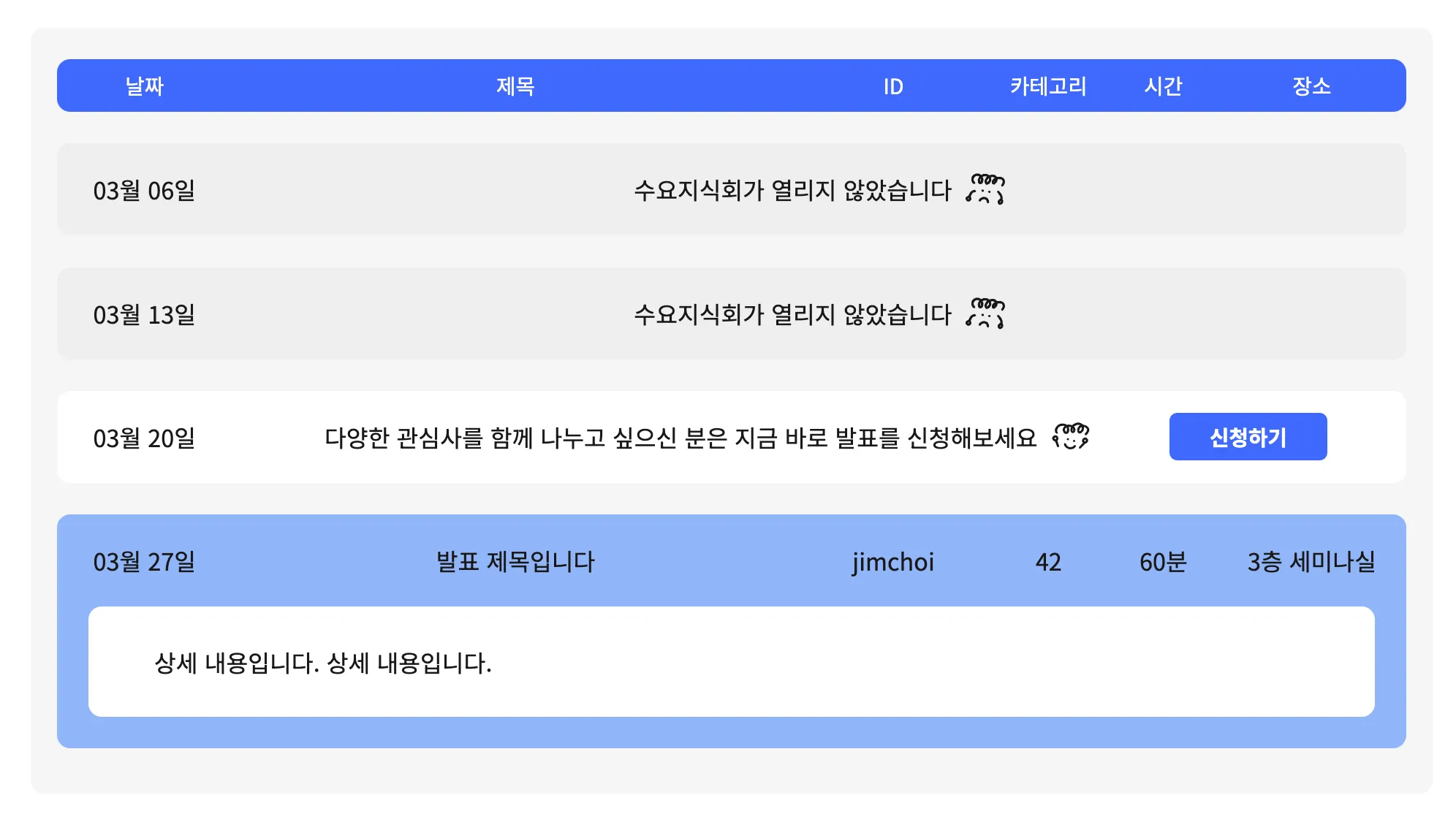 기존의 구글 스프레드시트로 운영되던 시스템을 개선하기 위해 새로운 수요지식회 신청 서비스를 오픈했습니다. 수요지식회 신청은 물론 예정된 발표 및 전체 일정 확인, 나의 발표 기록을 확인 하실 수 있습니다.