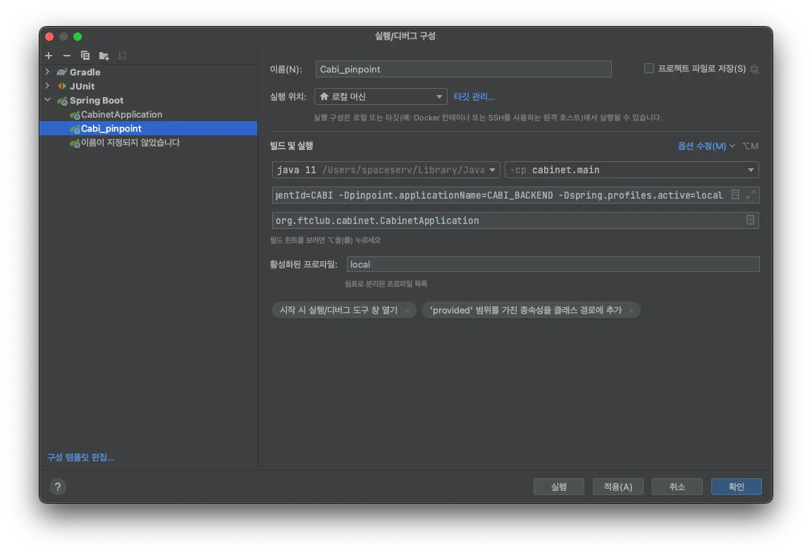 -javaagent:{핀포인트 에이전트 디렉토리}/pinpoint-agent-2.5.2/pinpoint-bootstrap-2.5.2.jar -Dpinpoint.config={핀포인트 에이전트 디렉토리}/pinpoint-agent-2.5.2/pinpoint-root.config -Dpinpoint.agentId=CABI -Dpinpoint.applicationName=CABI_BACKEND -Dspring.profiles.active=local