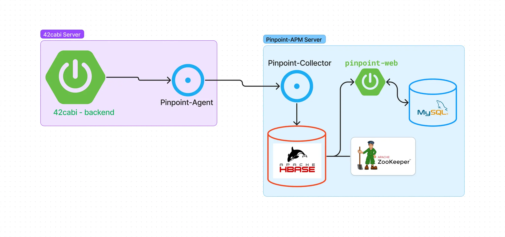pinpoint-agent : 우리가 만든 Spring 서버에서, 필요한 내용들을 수집하여 pinpoint colellector 로 보냄