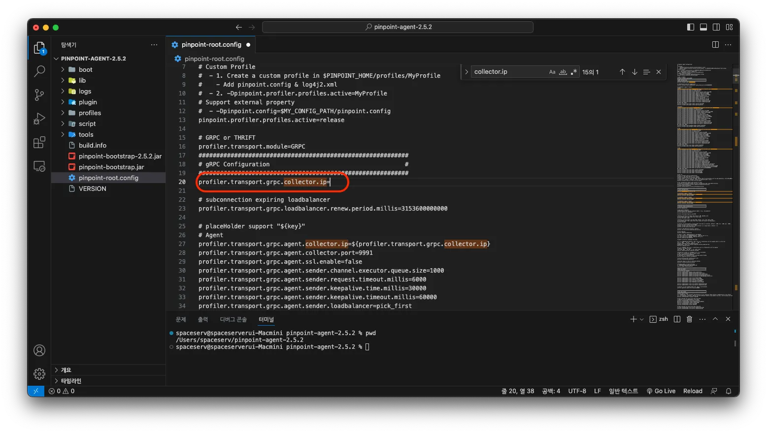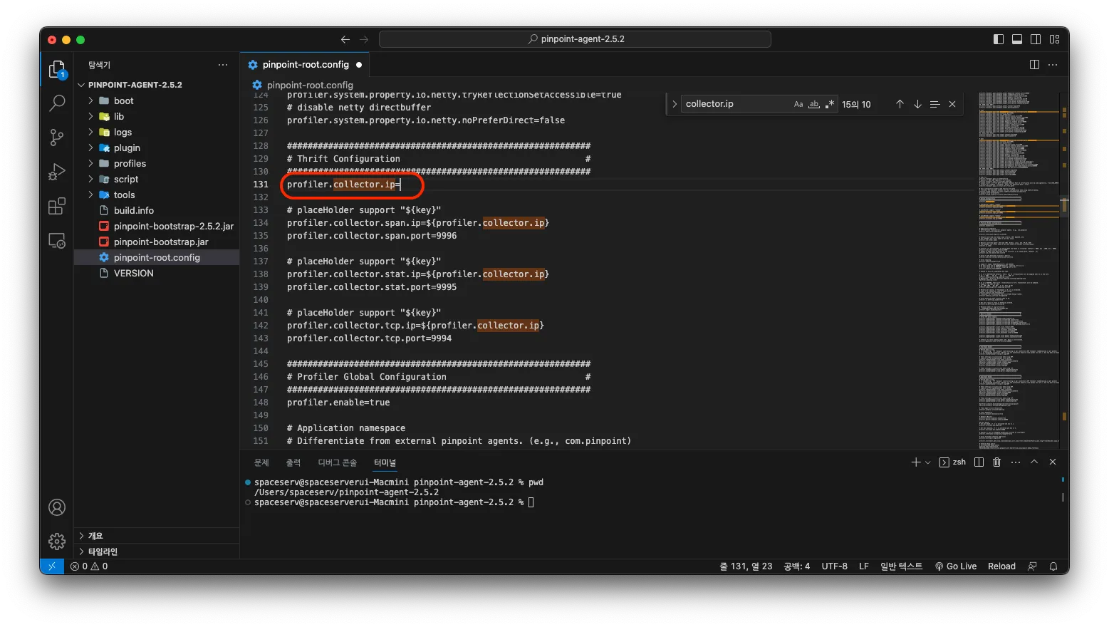 위에서 docker로 설치한 pinpoint-collector 가 위치한 곳의 ip 를 입력하면된다