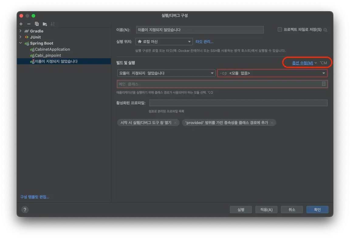 처음엔 아무것도 지정이 안되어있을텐데, 일단 오른쪽 위 옵션수정을 눌러서 JVM 옵션을 줘야한다.