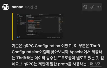 기존은 gRPC Configuration 이었고, 이 부분은 Thrift Configurataion이길래 찾아보니까 Apache에서 제공하는 Thrift라는 데이터 송수신 프로토콜이 별도로 있는 것 같네요..! gRPC는 저번에 말한 proto를 사용하는.. 더 보기