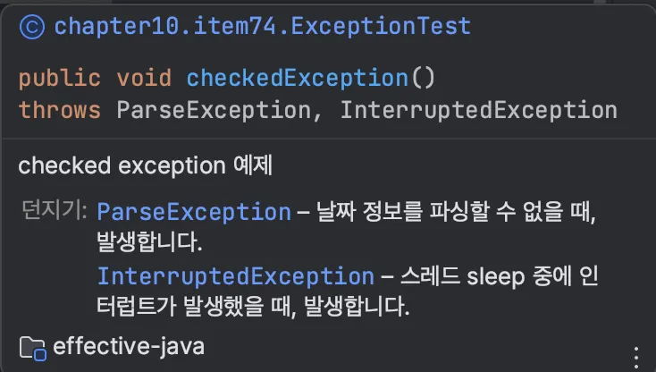 이렇게 @throws 자바독의 태그를 이용하여 명세를 하면 클라이언트 측에서 이 메소드를 사용할 때, 어떤 상황에서 어떤 에러가 발생하는지를 명확히 인지하고 코드를 작성할 수 있다.