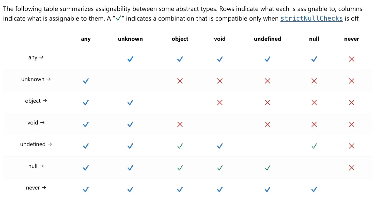 any, unknown, object, void, undefined, null, never 할당 호환성