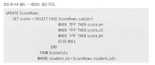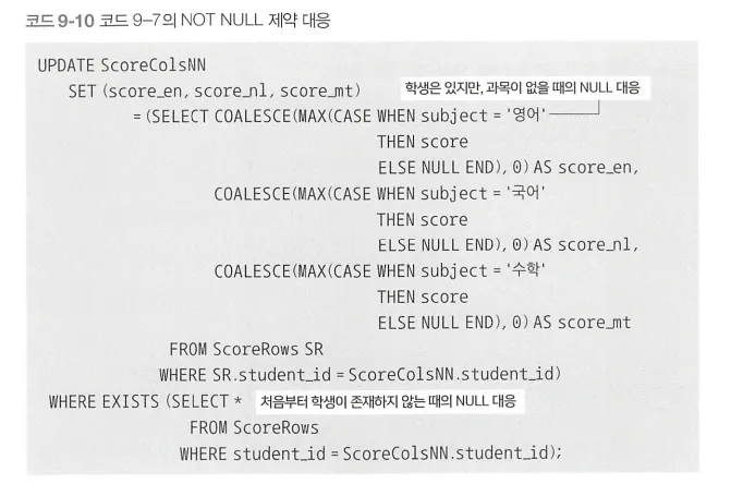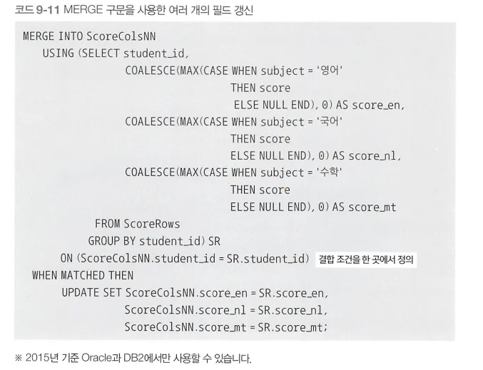 UPDATE 를 사용할 때는 2개의 장소에 분산되어 있던 결합조건((ScoreColsNN.student-id=SR.studentid)을 ON구로 한번에 끝낼 수 있다.