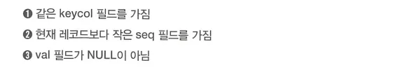 다음과 같은 3가지 조건을 만족하는 레코드 집합에서 가장 큰 sql 값을 가진 레코드를 찾아서 해당 레코드의 val 값으로 갱신한다.