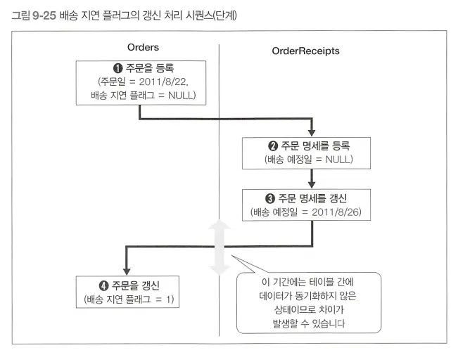 배송 예정일이 주문 등록 후에 갱신되는 경우에는 Orders 테이블의 배송 지연 플래그 필드와 OrderReceipts 테이블의 배송 예정일 필드가 실시간으로 동기화되지 않으므로 차이가 발생할 수 있다.