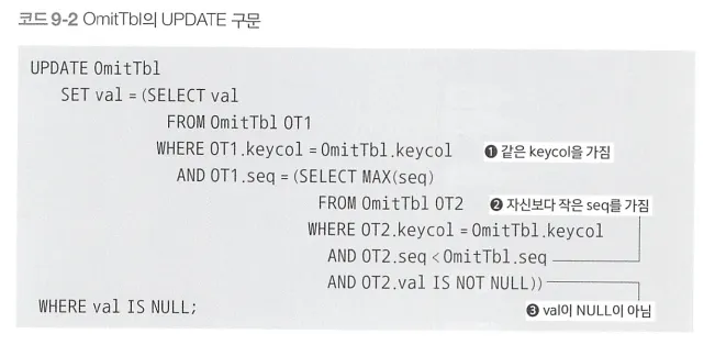 MySQL처럼 갱신 SQL에서의 자기 참조를 허가하지 않는 데이터베이스에서도 사용할 수 있다. (참조 대상 테이블과 갱신 대상 테이블이 서로 다르기 때문에)