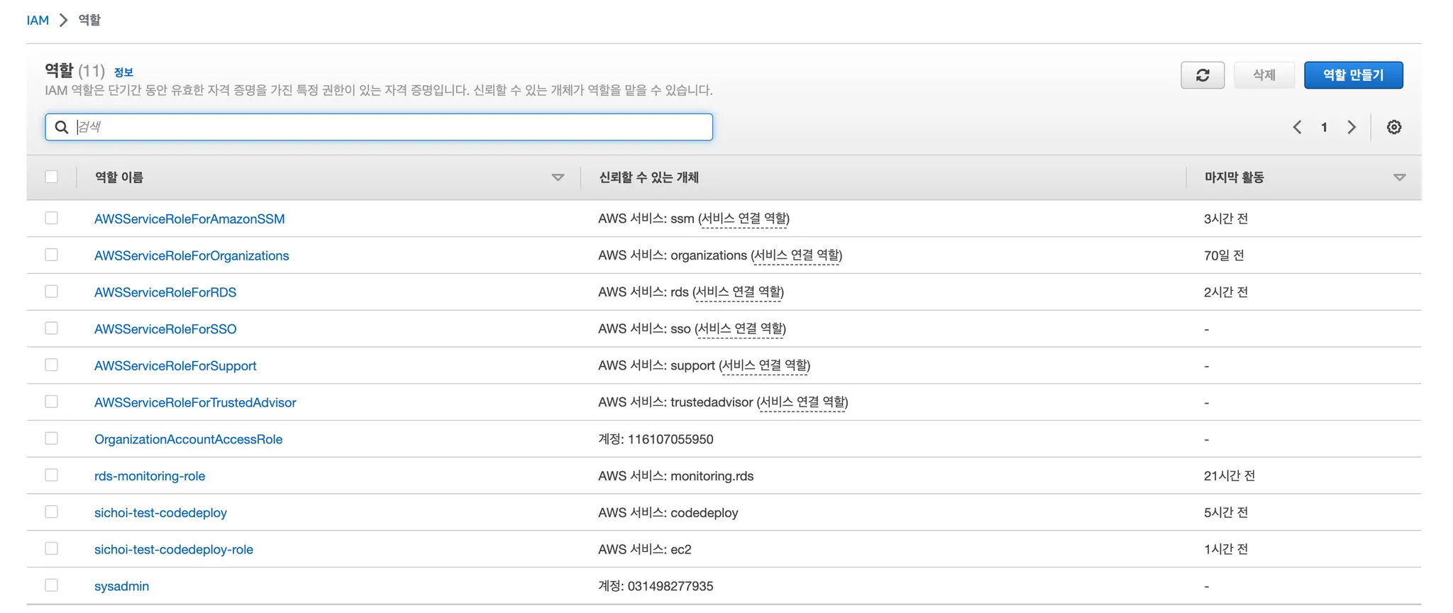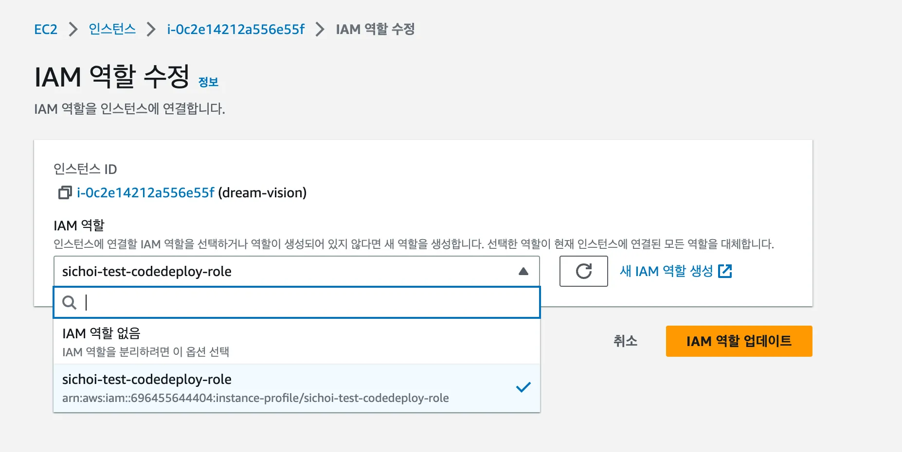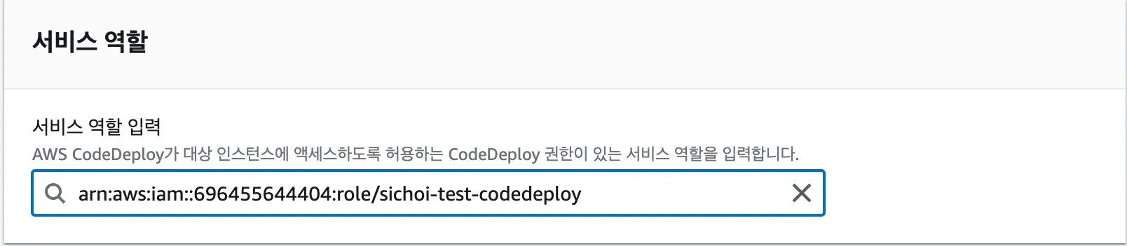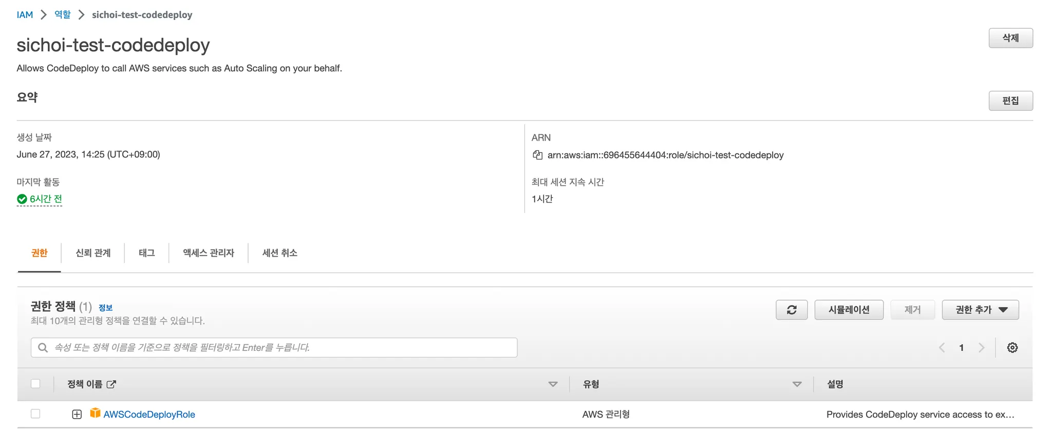 sichoi-test-codedeploy-role이라는 이름의 역할을 AWS 서비스 중 EC2 인스턴스가 맡고 있다.
