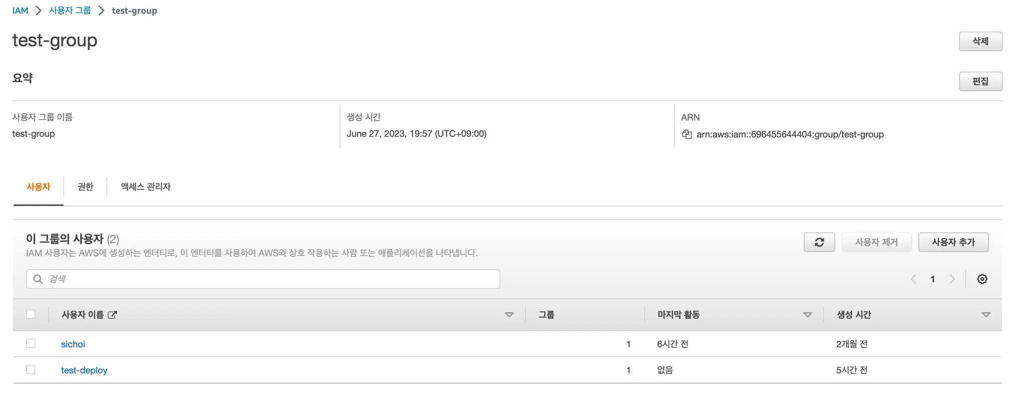 사진처럼 sichoi와 test-deploy라는 사용자를 하나의 그룹으로 묶고, 동일하게 AdministratorAccess라는 정책을 부여할 수 있다.