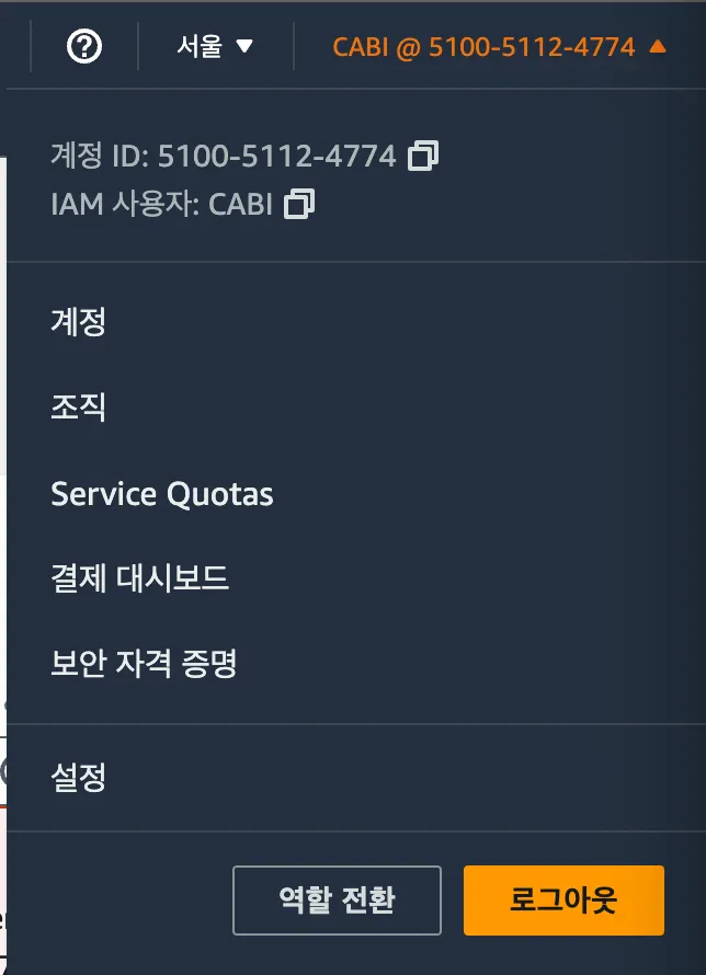 까비도 IAM 사용자를 부여 받아서 이용하고 있다. 이노베이션 아카데미 재단 측이 루트 계정을 소유하고 있고, 과거 보컬이셨던 doosoo님께서 IAM 루트 계정을 이용하여 CABI라는 IAM 사용자를 만들어 까비팀에게 제공해주셨다. (현재는 크리스틴님이 담당하고 계신다.)