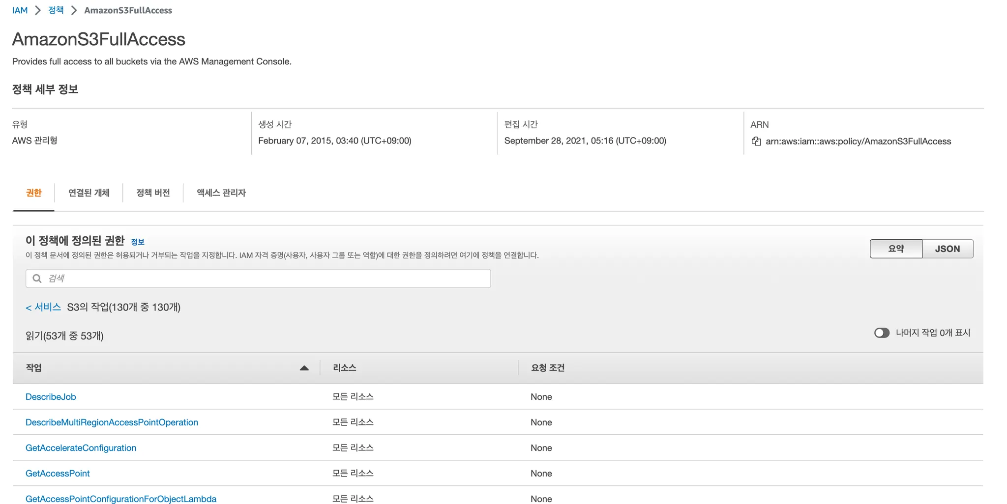 즉, AmazonS3FullAccess를 부여받은 객체는 S3와 S3 Object Lambda 서비스를 이용할 수 있는 권한을 갖는다.