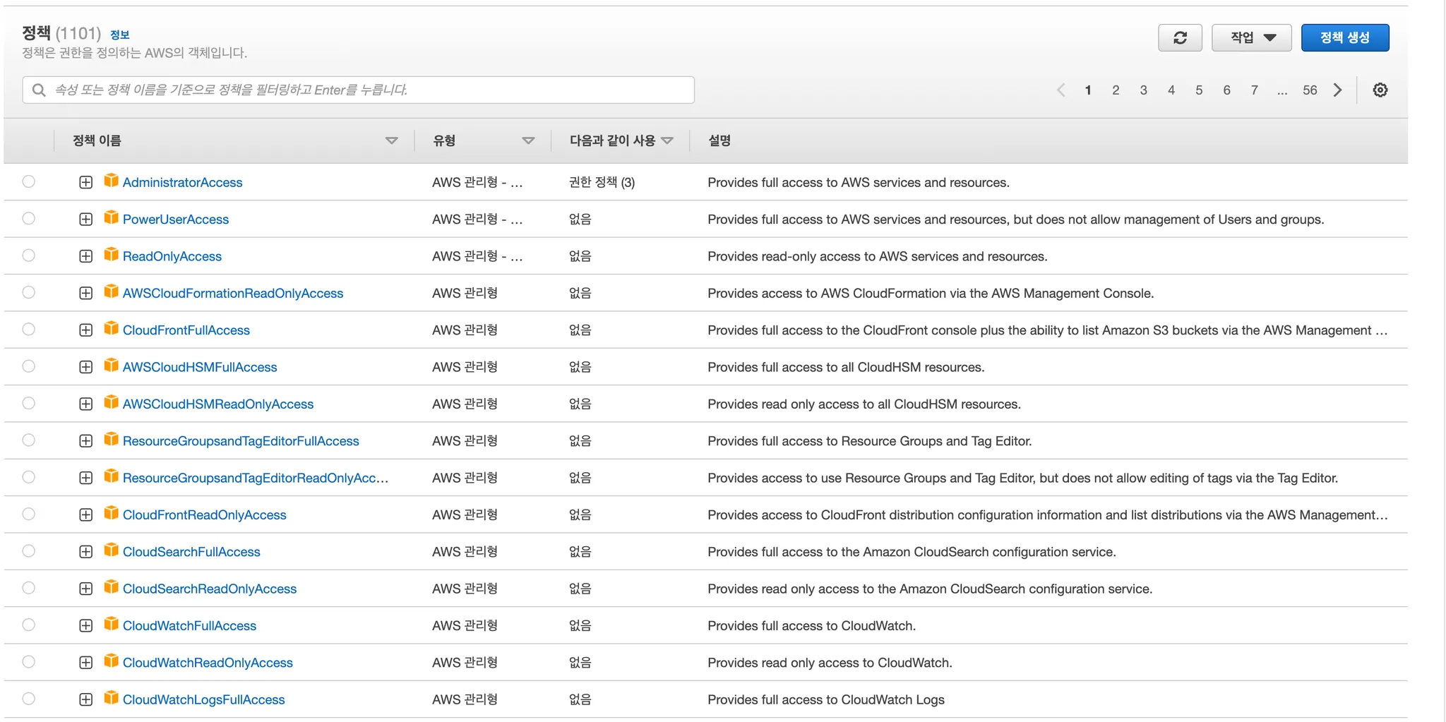 AWS에는 현재 1101개의 정책이 있으며, 루트 사용자는 이러한 모든 정책에 대한 제어와 액세스 권한을 갖는다. 이는 루트 사용자가 AWS 계정의 모든 리소스와 서비스에 대한 제어를 갖고 있다는 것을 의미한다.