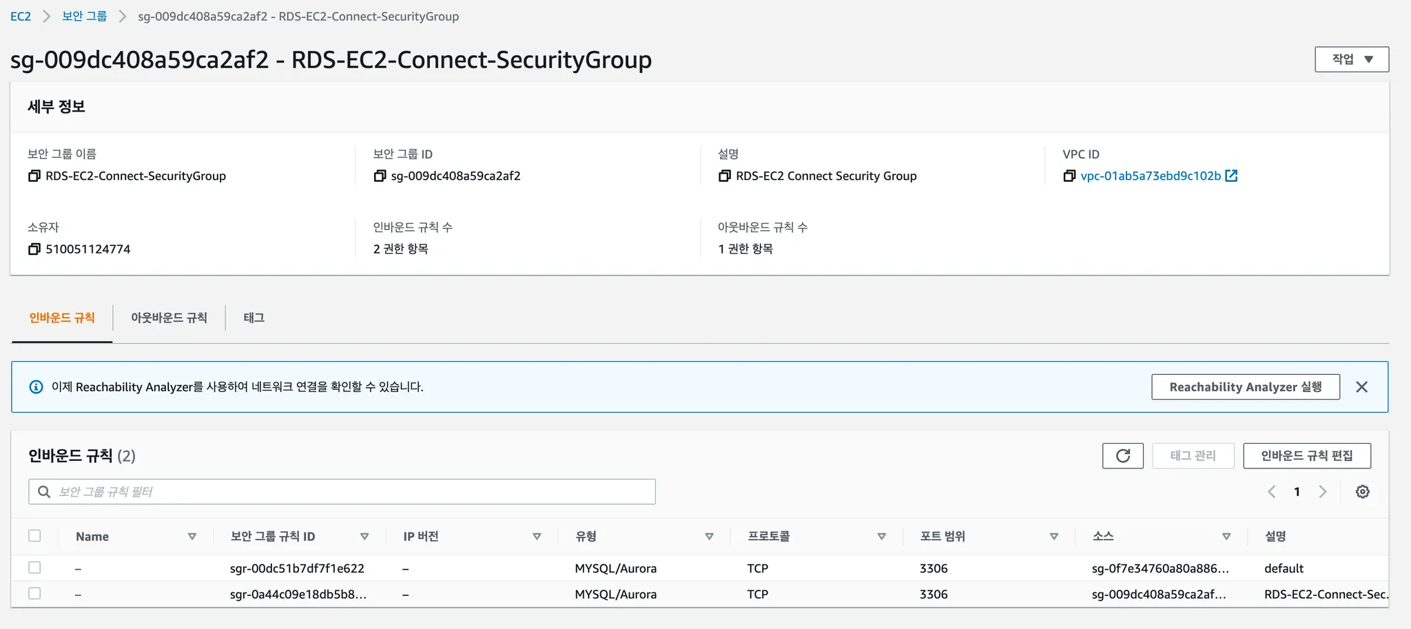 보안 그룹의 인바운드 규칙을 다음과 같이 설정하게 되면 같은 VPC에 있는 인스턴스들끼리 3306 포트를 통해 TCP 프로토콜로 통신할 수 있도록 하겠다는 의미가 된다.