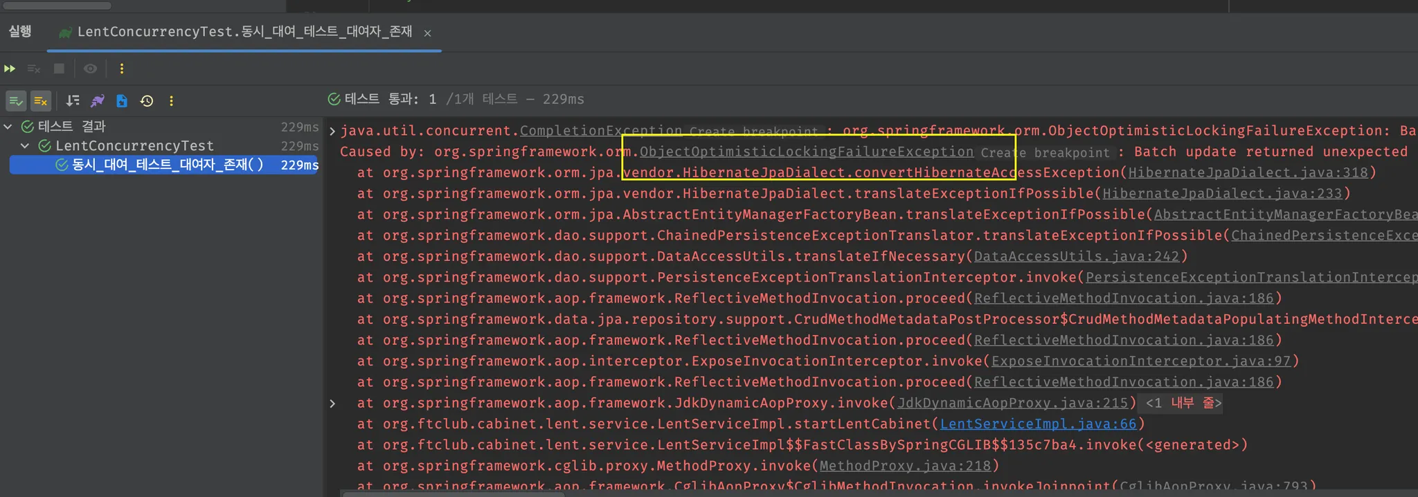 낙관적 락을 수행한 것에 알맞게, 먼저 커밋이 성공한 한명만 대여를 성공하고, 나머지는 실패했다. + 버전 충돌로 인한 ObjectOptimisticLockingFailureException이 발생한 것을 볼 수 있다.