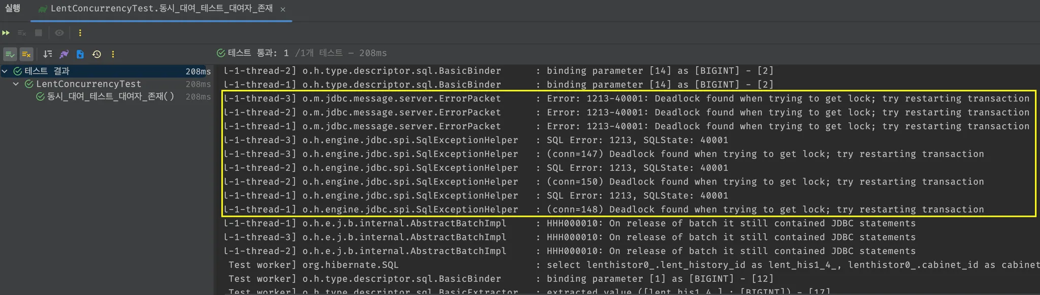 → 그 이유는, lent_history의 row를 insert하고(여기까지 문제없음), 외래 키 제약조건으로 연관되어 있는 cabinet row의 값을 READ(S Lock 획득), UPDATE(X Lock)할 때 상호 대기 상태에 놓여있게 되기 때문이다.
