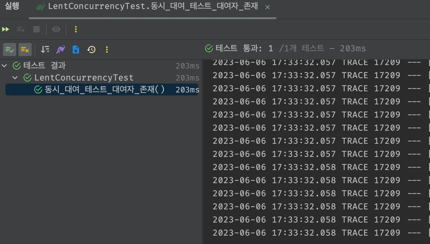 // 비관적 락을 통해, 동시적 대여가 X Lock을 획득하는 순으로 처리된다. (3/3)