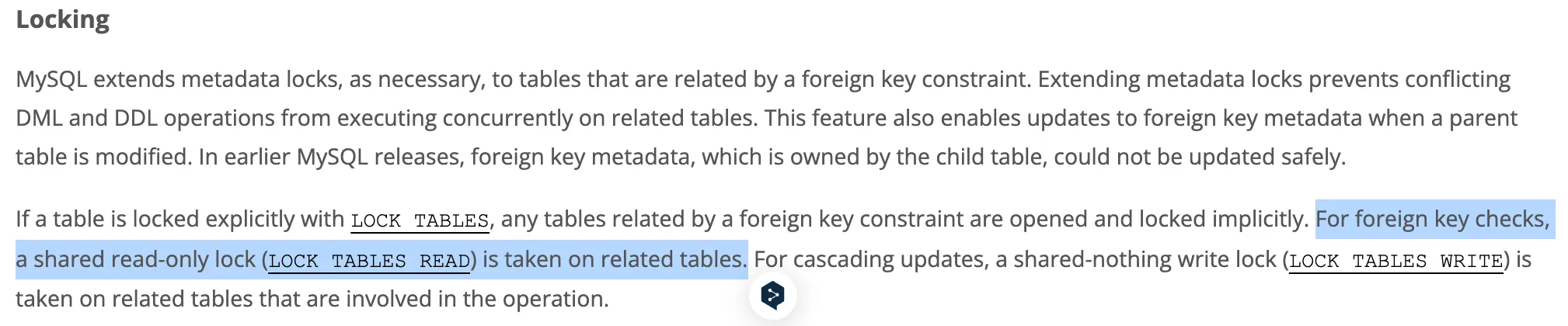 → 외래키 제약조건으로 인해서, cabinet의 레코드까지 S Lock이 전파된 것이므로, 외래키로 이어진 연관관계를 끊으면 S Lock이 걸리지는 않을 것이다. 하지만, 이는 데이터 정합성을 위한 부분을 별도적으로 처리해주어야 하는 방식임과 동시에, RDB의 큰 기능을 포기하는 것으로 느껴져서 직관적으로 썩 좋은 방법같지는 않다.