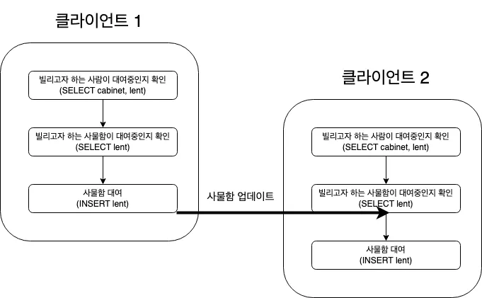 두 세션 다 사물함의 이용자 수가 (0/1)로 인식되므로, 대여가 성공하게 된다.