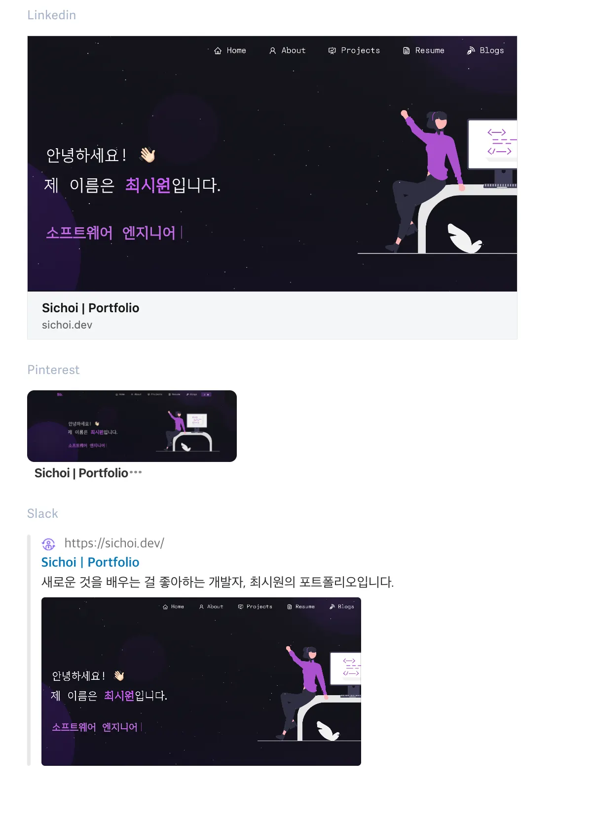 카톡이나 노션같은 플랫폼에 내 사이트 링크를 공유할 때 이런식으로 섬네일 정보가 제대로 보이지 않는 경우가 종종 있다.