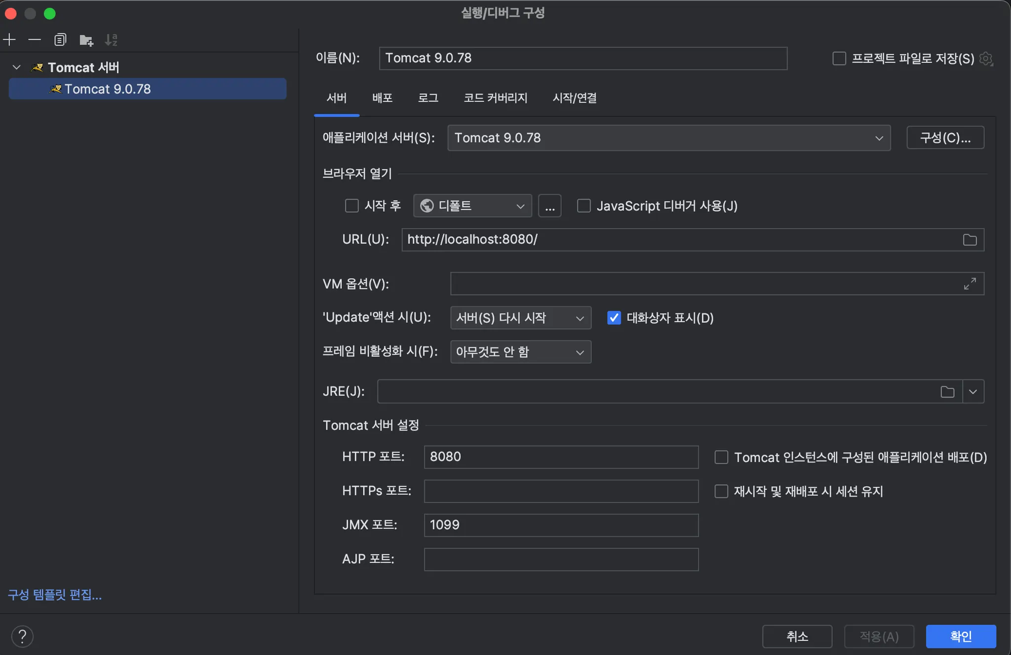 방금 설치한 Tomcat의 경로를 설정하였고, 빌드 툴로는 Gradle을 이용하였다.