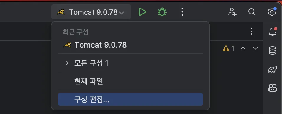 우측 상단의 구성 편집을 클릭하여, 실행/디버그 관련 설정을 할 수 있다.
