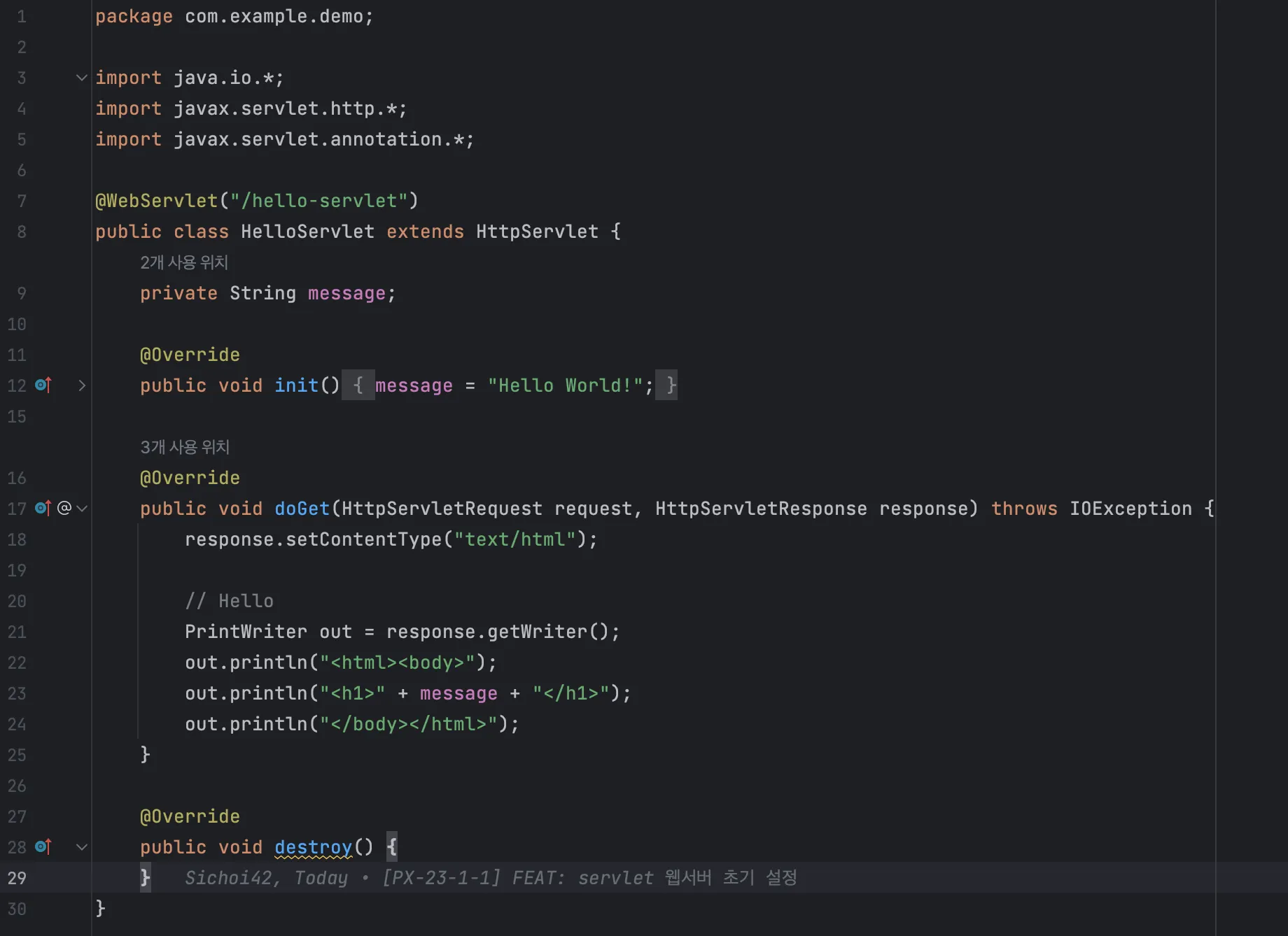 C++의 생성자와 소멸자와 비슷한 느낌으로 프로그래머는 init과 destroy를 Override하여 Servlet 객체가 생성하거나 소멸하는 시점에 공통적으로 진행하고 싶은 작업을 설정할 수 있다. (ex. 로그 남기기 등)