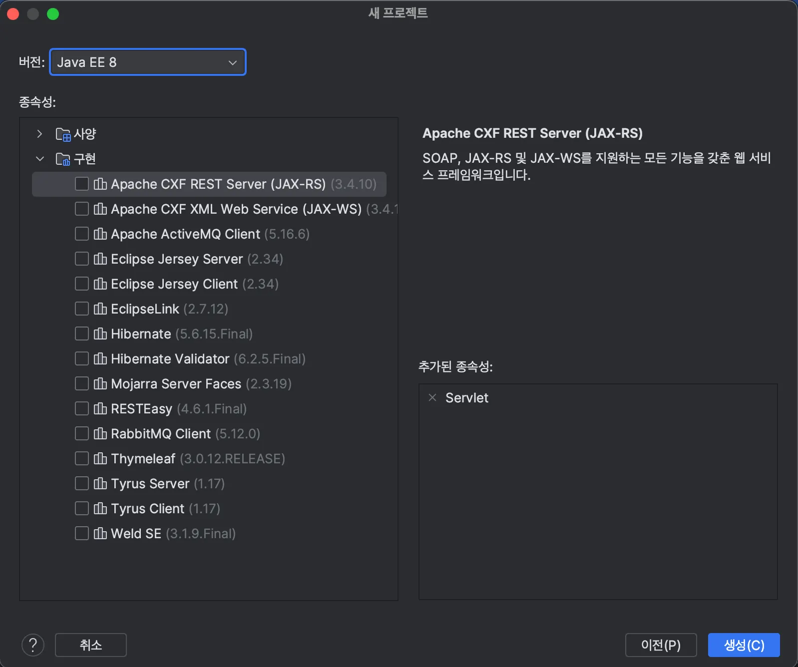 Java EE 8 버전을 선택하고, 종속성은 Servlet만 선택했다.