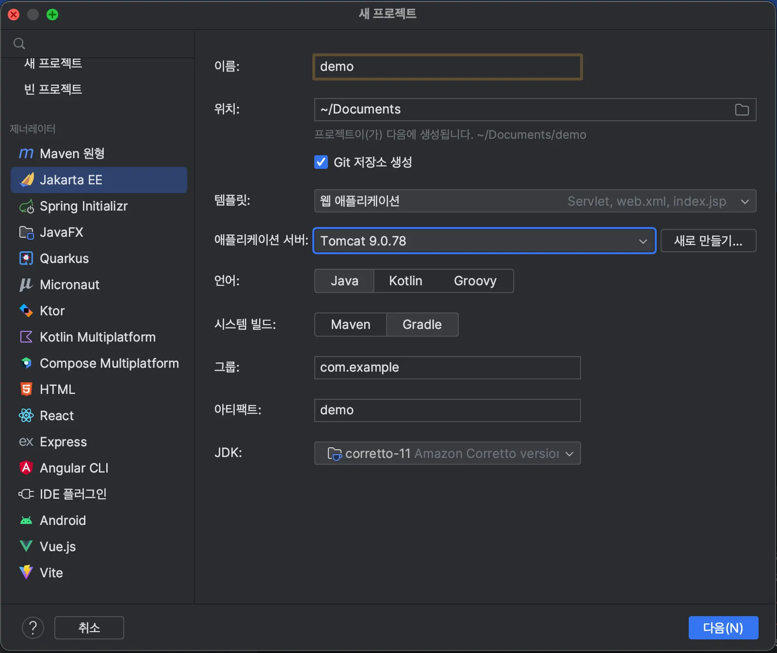 개발환경은 IntelliJ IDEA Ultimate이며, Jakarta EE를 이용하여 빠르게 구축하였다.