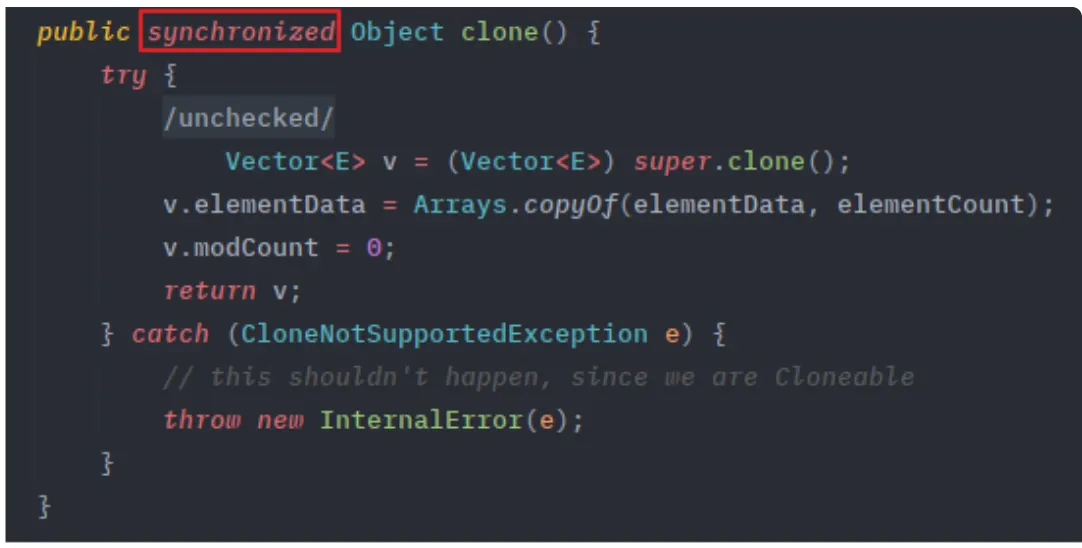 하지만 아래 그림처럼 ArrayList에서는 동기화가 없지만, Vector에는 synchronized 키워드가 붙어있어 동기화를 제공한다.