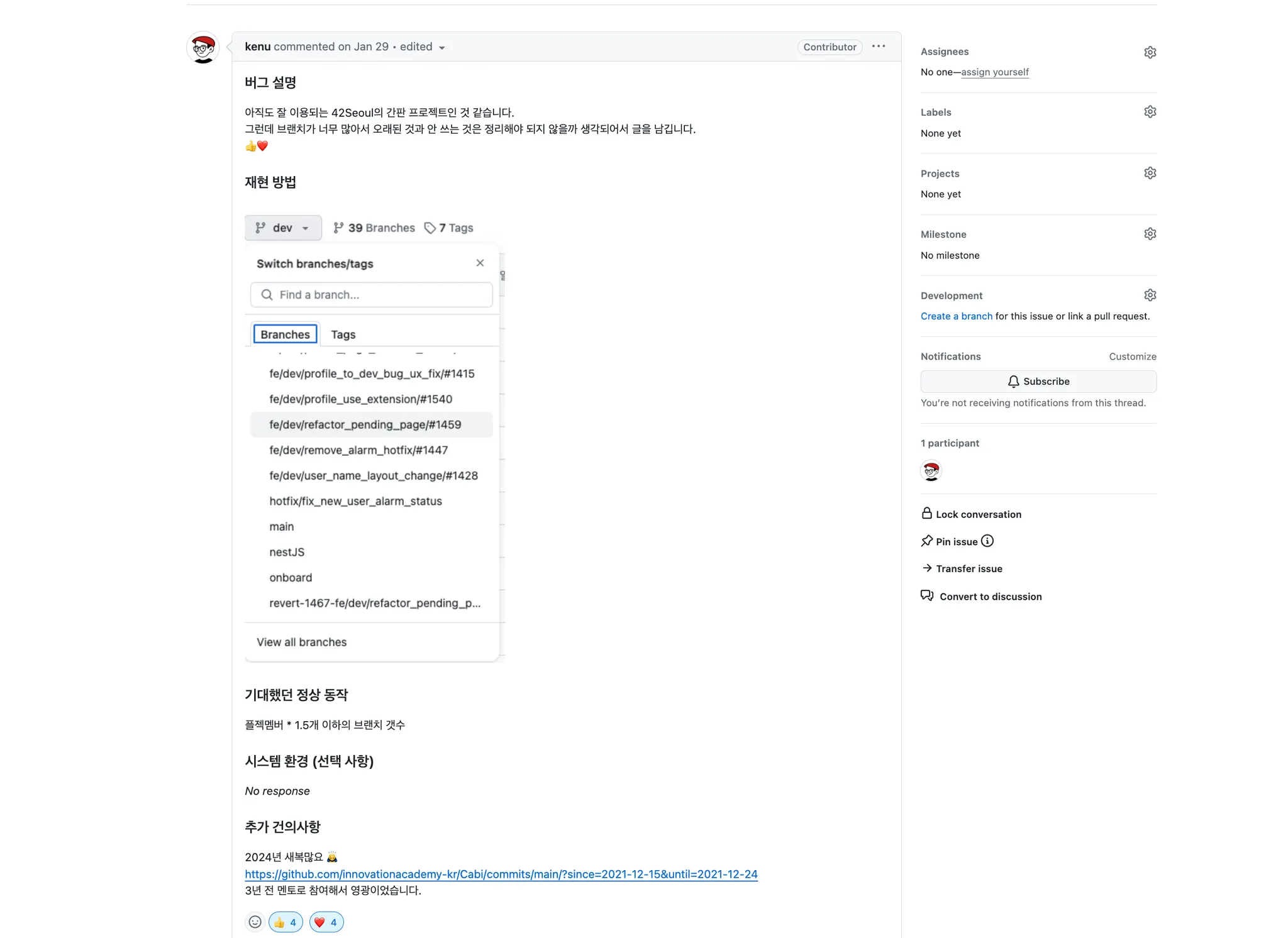 아마도 Draft PR을 위해 만든 브랜치나, 병합 후에 삭제하지 않은 브랜치가 하나씩 쌓이다보니 많아진 것 같아요. 예전에 까비 팀을 담당해주셨었던 멘토분도 걱정을 가지고 이슈를 남겨주셨었네요..!