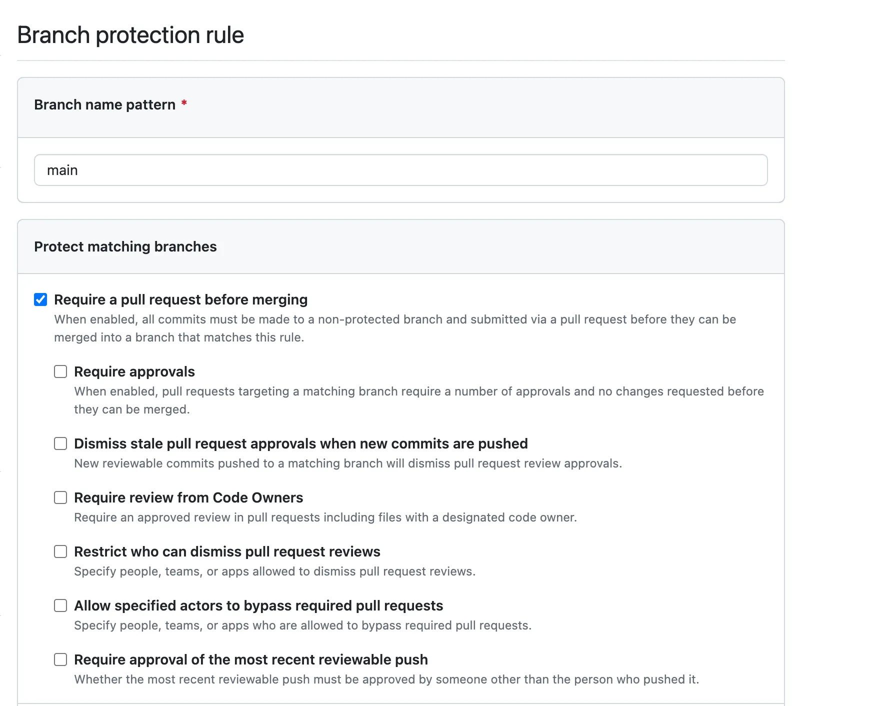 main 브랜치는 여기에 추가로 PR을 통해서만 커밋할 수 있도록 규칙을 추가했어요.