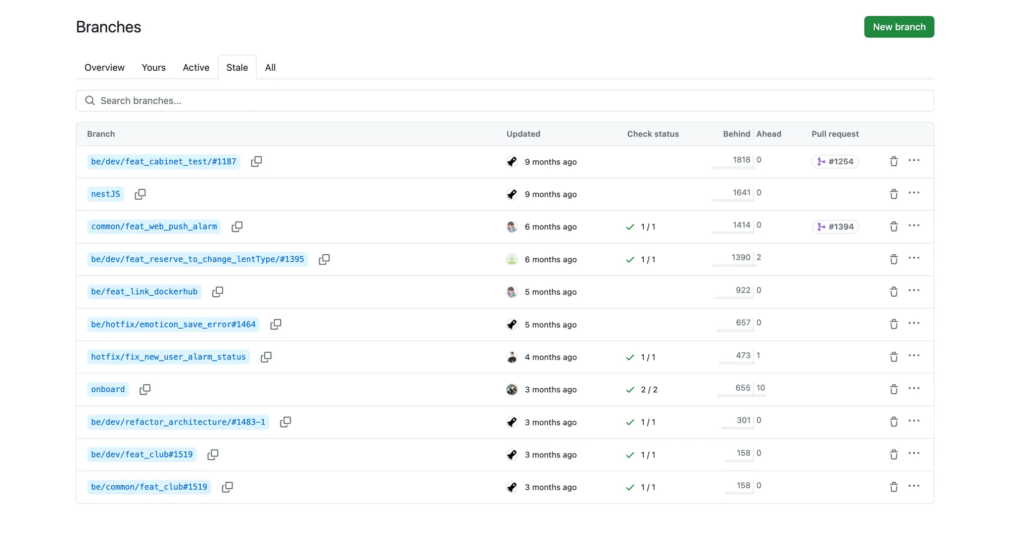 또 오랫동안 활동이 없는 브랜치 또한 많이 쌓여있어요.
